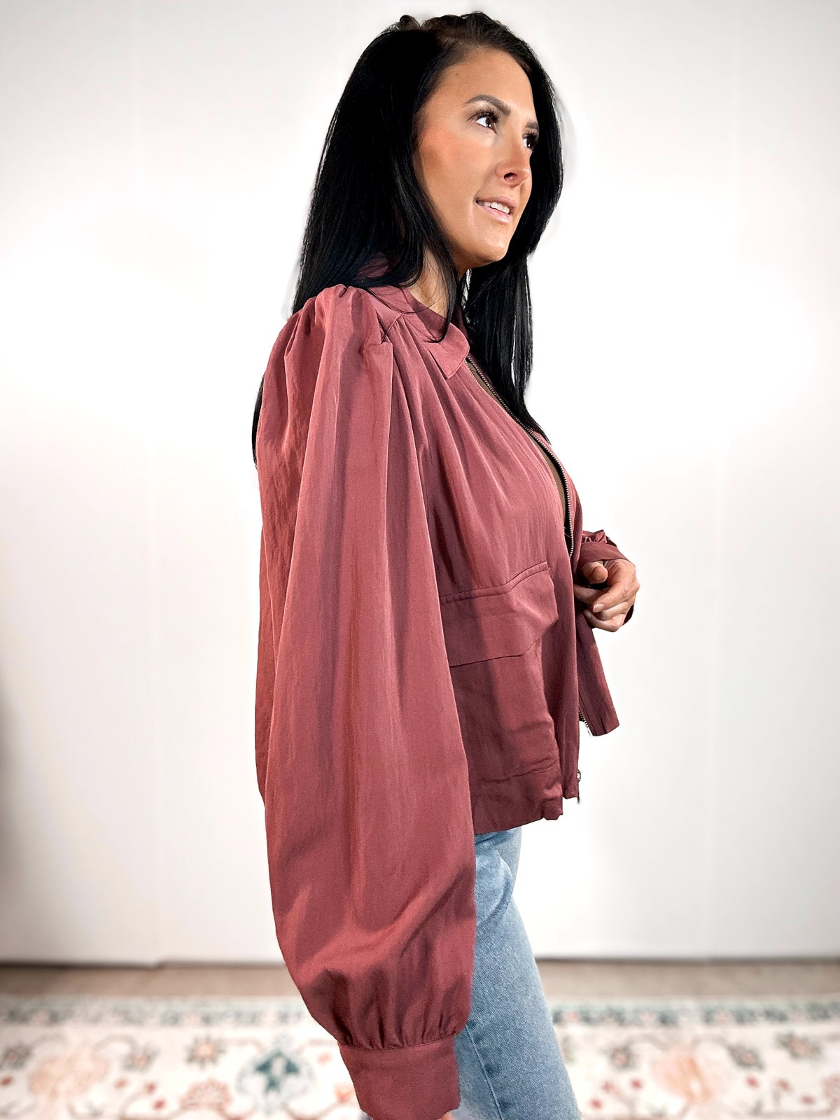 That perfect “throw it on and instantly look put together” jacket! The mulberry color is SO pretty and the fabric is buttery soft with that smooth, drapey feel you only get with viscose. It has a zip front, functional flap pockets, and the cutest slightly polished shape that works for everyday but still feels elevated. Throw it over a bodysuit or tee with denim and you’re DONE!